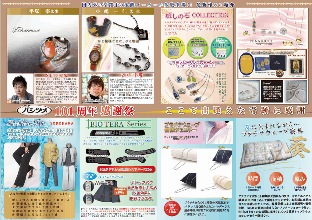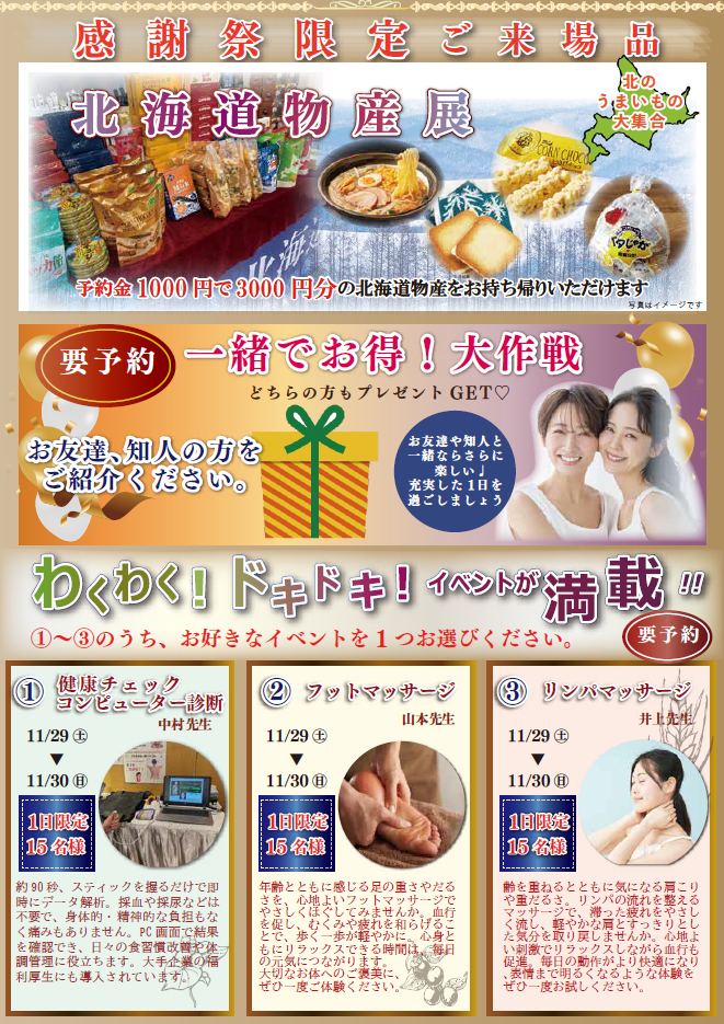 11月29日(土)・30日(日)、ソシエハシヅメ呉羽店にて「101周年感謝祭」を開催!北海道物産展では、予約金1,000円で3,000円分のお土産をお持ち帰りいただけます。リンパマッサージや健康チェックなど、選べる体験イベントもご用意。お友達紹介でプレゼントも!心も体もリフレッシュできる2日間をお楽しみください。